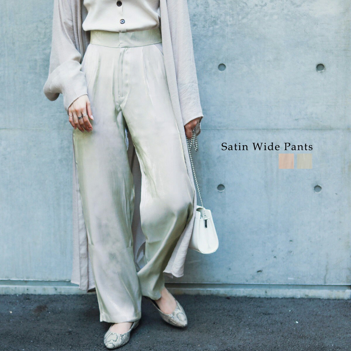 ワイドパンツ レディース パンツ ハイウエスト ニュアンスカラー ワンマイルウェア サテン シアー シースルー 光沢 ウエストゴム ワイドシルエット ミント グリーン ベージュ シンプル 無地 きれいめ おしゃれ かわいい 大人 ゆったり