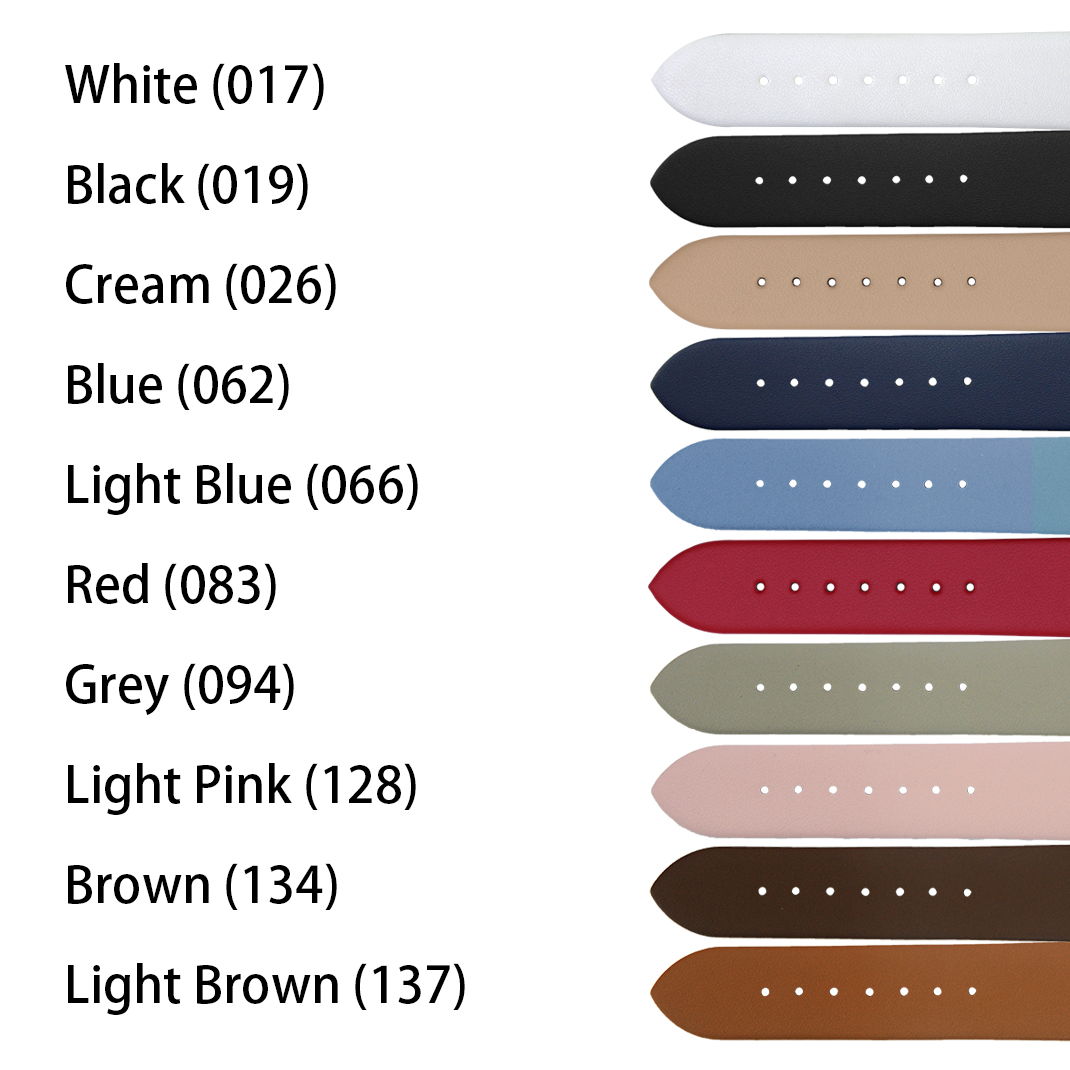 商品スペック カラー ホワイト White (017) ブラック Black (019) クリーム Cream (026) ブルー Blue (062) ライトブルー Light Blue (066) レッド Red (083) グレー Grey (094) ライトピンク Light Pink (128) ブラウン Brown (134) ライトブラウン Light Brown (137) 素材 カーフ(牛革) 長さ 【女性用サイズ】 剣先側105mm / 尾錠側70mm 厚さ 【女性用サイズ】 約2.5mm サイズ展開 【女性用サイズ】 E8mm - B8mm E10mm - B10mm E12mm - B10mm E14mm - B12mm ※【E】は時計に装着する側の幅、【B】はバックルの幅です。