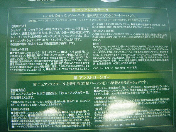 成分(彩 ニュアンスカラーN)水、セタノール、イソステアリン酸ヘキシルデシル、セトリモニウムクロリド、シクロメチコン、ジグリセリン、イソプロパノール、ベンジルアルコール、エタノール、メドウフォーム油、ジメチコン、PEG-5オレアミン、ベヘントリモニウムクロリド、ワセリン、ポリクオタニウム-7、ゼニアオイエキス、クララエキス、ローズマリーエキス、シラカバ樹皮エキス、カミツレエキス、PG、BG、水酸化K、尿素、グリコール酸、フェノキシエタノール、ベンザルコニウムクロリド、香料、(+/-)塩基性青99、塩基性黄57、塩基性黄28、塩基性茶16、塩基性赤76、HC青2、HC赤3、HC黄2(彩 アシストローション)水、モノエタノールアミン、PG、オレアミドDEA、コカミドDEA、コカミドプロピルベタイン、ステアルトリモニウムクロリド、コカミドMEA、ゼニアオイエキス、クララエキス、ローズマリーエキス、シラカバ樹皮エキス、カミツレエキス、BG、ポリクオタニウム-10、イソプロパノール、EDTA-4Na、メチルパラベン、香料美容室、サロンから一般向けまで、理美容機器・道具の販売、通販 美容院 ・ 美容室 ・ 床屋 や ネイルサロン 専売品( プロ専用商品 )から サロン ・ 美容師 御用達の シャンプー ・ トリートメント をはじめとする ヘアケア用品 など様々な業務用品を販売!普段通っている エステ で日頃から気になっていた専門道具を始め、話題の基礎化粧品、プロが芸能人の メイクアップ に使用する コスメ ・ 業務用化粧品 ・ サプリメント ・ ネイル用品 ・ アロマ用品 ・ フットケア用品 ・ 美容機器 など多数の美容商材を取り扱っています。