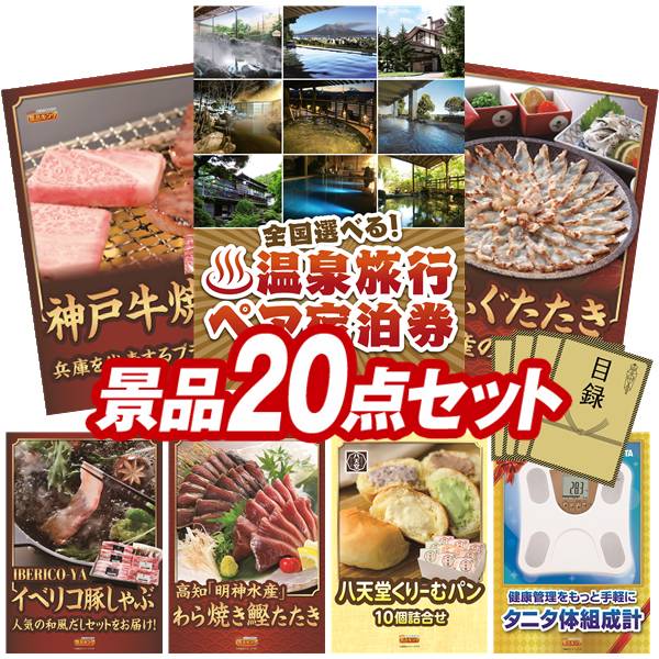 新年会景品20点セット【選べる!全国温泉旅行ペア宿泊券、神戸牛すき焼き用 肩・肩バラ 400g 他】送料無料!特大パネル・目録・特典付き!ビンゴや二次会景品にも!